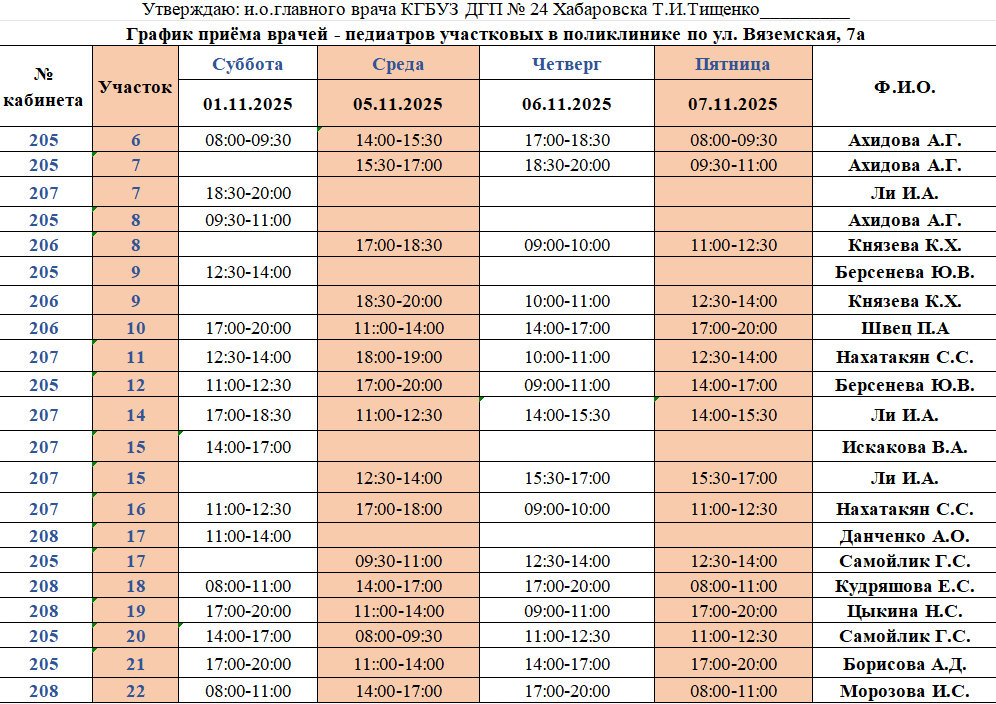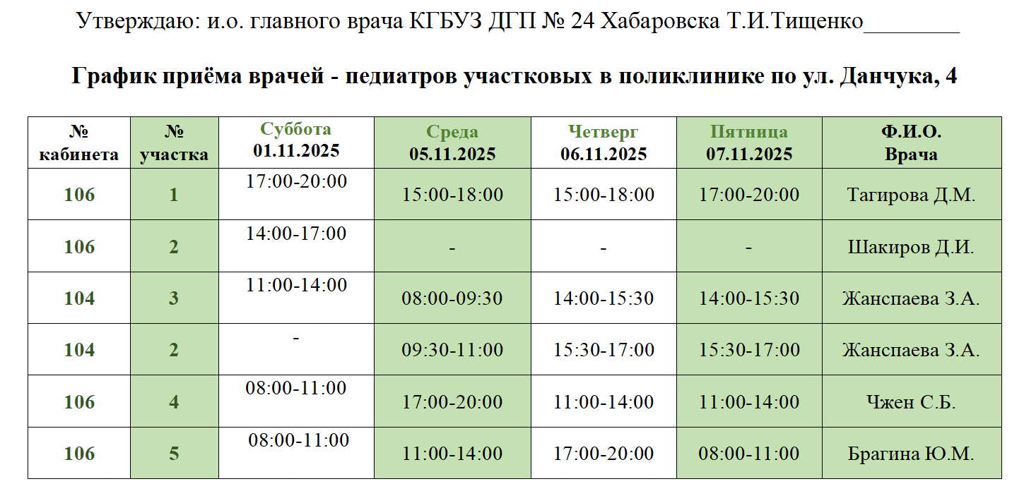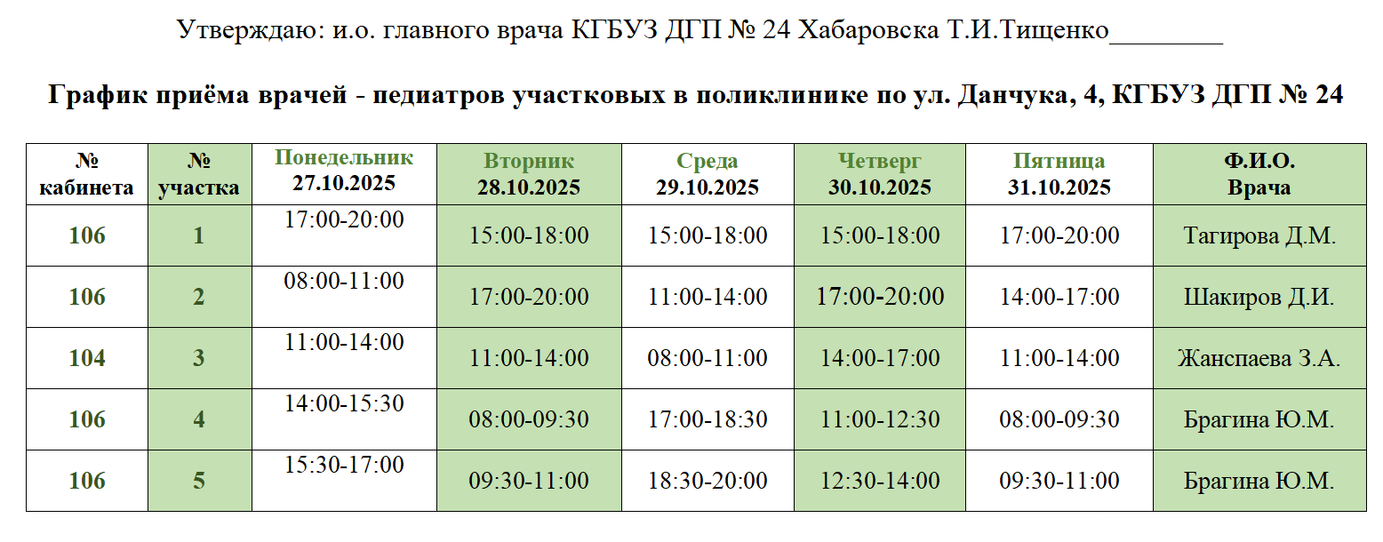 График работы врачей обновляется каждые четверг-пятницу, просим это учесть при записи на сайте госуслуг: gosuslugi.ru и uslugi27.ru. Если не получается записаться к врачу, значит ведутся технические работы на сайте госуслуг и услуги27. Либо на Вашего ребёнка не заведена электронная карта в МИС Барс, для этого вам необходимо подойти с документами (медицинский полис, свидетельство о рождении) в регистратуру.